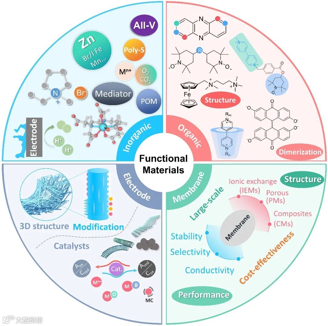 用于氧化还原液流电池的功能材料:包含无机及有机活性物质、功能电极材料设计策略、功能膜材料设计及结构