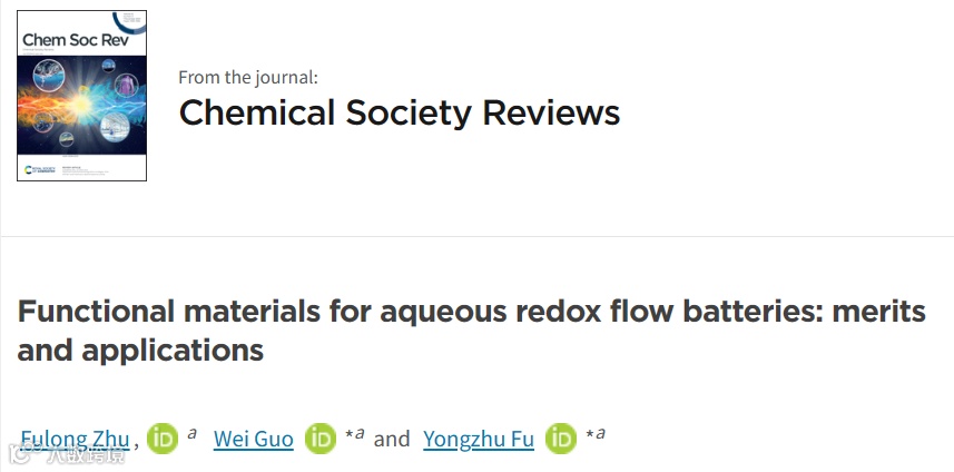 近日,来自郑州大学的朱福隆博士研究生、郭玮教授和付永柱教授,在国际知名期刊Chem. Soc. Rev.上发表题为“Functional Materials for Aqueous Redox Flow Batteries: Merits and Applications” 的综述文章。该综述文章分析了应用于液流电池的功能材料,包含活性物质、电极材料及膜材料,同时汇总了近期在研究这些功能材料上的进展。