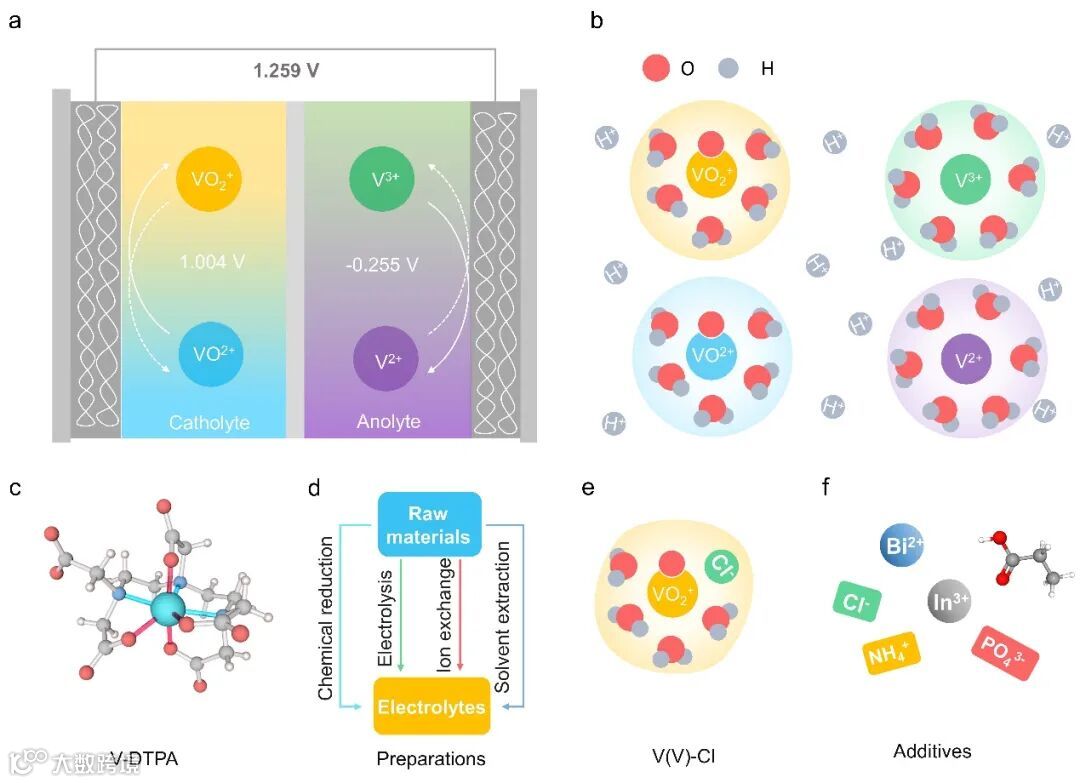 图3 (a) 全钒RFB的示意图,(b) 酸性溶液中钒离子存在的不同形式,取决于它们的氧化态,(c) 通过DTPA配体的配位来改善VRFB的性能,(d) 钒基电解液的制备方法,(e) V(V)-Cl络合物以提高钒离子的溶解度和稳定性,(f) 用于催化钒转化动力学的无机和有机添加剂。