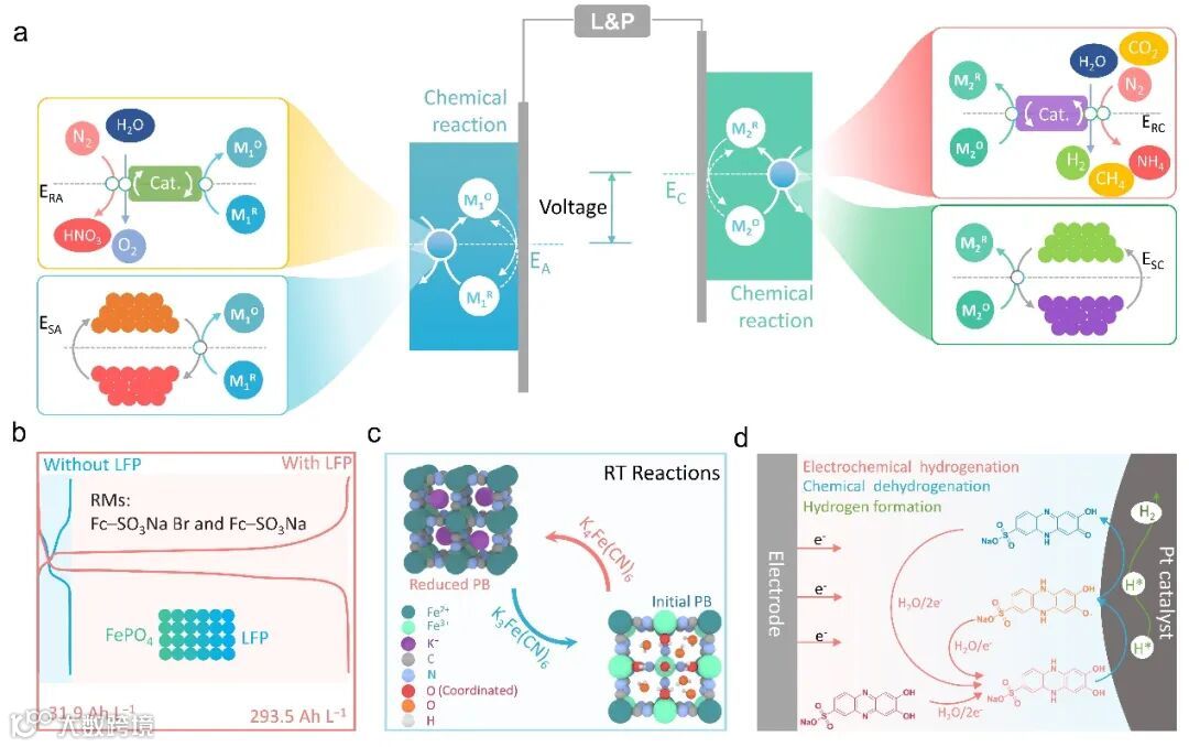 图5 (a)典型的氧化还原介质基水系RFB(RTFB)的示意图,其中EA和EC分别代表阳极和阴极介质的电位。ERA和ERC表示阳极和阴极过程的催化反应电位,而ESA和ESC代表阳极和阴极储能材料的电位。M1O和M1R表示阳极介质的氧化和还原态,M2O和M2R表示阴极介质。(b) 将Zn-Fc 水系RFB的电压曲线与在阴极槽中加载磷酸铁颗粒的电池进行了比较。(c) 展示了普鲁士蓝的最可能的原始和还原结构,以及氧化还原反应的示意图。(d) 呈现了使用RTFB的DHPS介质进行H2生成的逐步化学-电化学反应机制的示意图。
