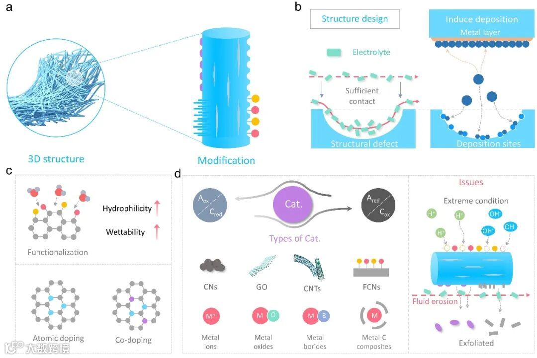 图8 (a) 对碳毡电极的3D结构和修改的图示,包括缺陷、功能基团、涂层或嵌入材料。(b) 缺陷的结构设计以促进电解质输运并创造诱导沉积的活性位点。(c) 功能化和原子掺杂技术的图示。(d) 各种催化剂材料的图示,及用于增强反应动力学以及涂层电极所面临的挑战。