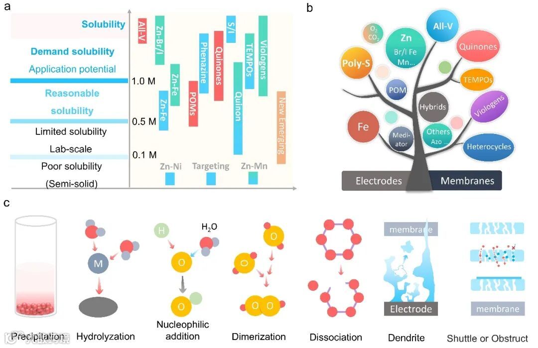 图2 (a): 评估实际应用潜力和当前氧化还原活性材料的溶解度水平的溶解度标准,红色表示酸性条件,蓝色表示碱性条件,青色表示中性条件,橙色表示新功能材料的部分。(b):当前RFB系统的典型氧化还原活性材料和类别。(c):RFB中可能的容量损失机制的示意图,包括氧化还原活性物质、电极和膜。