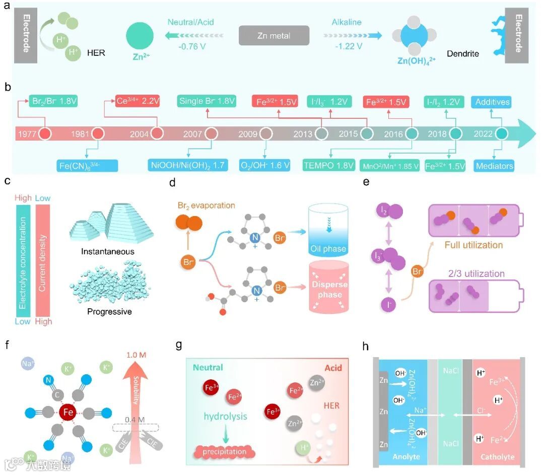 图4 (a) 在不同条件下(包括中性、酸性和碱性环境)的锌阳极的氧化还原电位和主要挑战的示意图,如HER和枝晶形成。(b) ZFB的发展历史和电压。(c) 示意图显示锌在不同浓度和电流密度下的沉积行为。(d) 图示溴偶联物,包括相关问题和络合剂。(e) 说明使用溴化物作为络合剂稳定碘的概念。(f) 为了增强溴化物的溶解度,通过不同的阳离子来打破Fe(CN)63−/4−的共有离子效应(CIE)。(g) 中性和酸性锌-铁流电池的问题。(h) 三种电解质和双膜的混合锌-铁流电池的示意图。