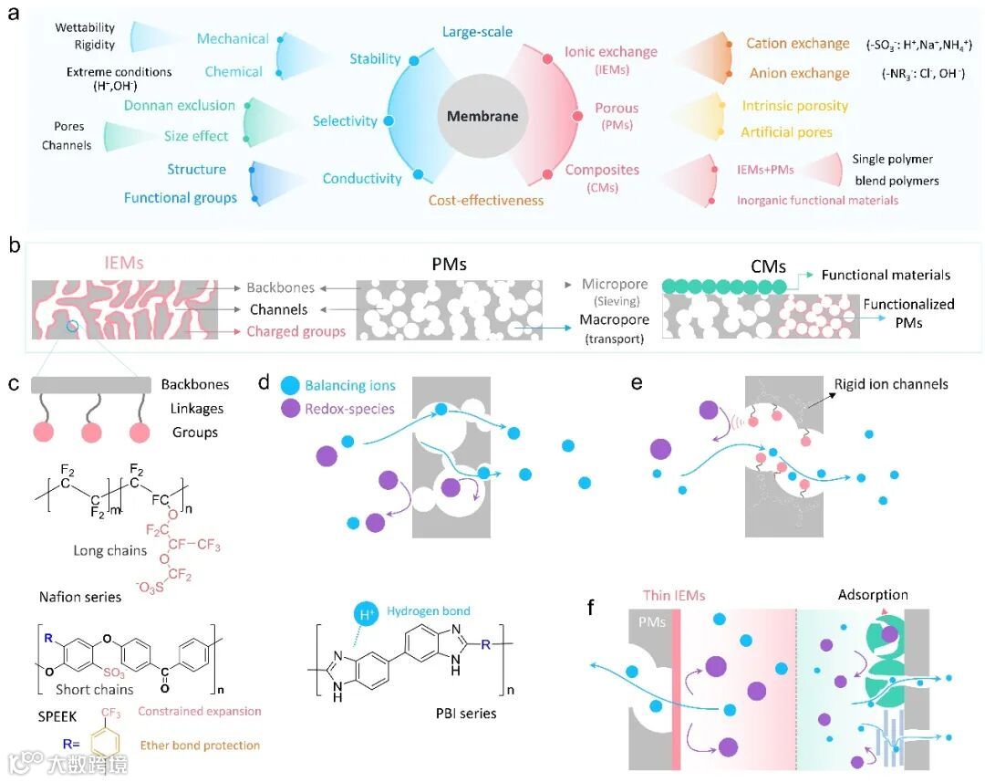 对膜的严格要求需要开发具有高离子传导和选择性的创新材料。下一代膜材料必须平衡多个参数,包括离子传导性、离子选择性、理化稳定性和成本。未来的研究工作还应着重阐明膜中平衡离子的传输行为,以及氧化还原活性物质和膜的独特影响。