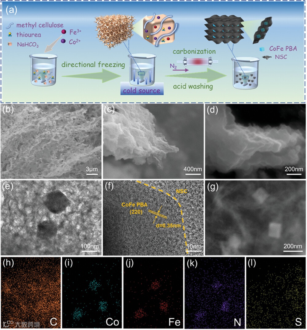 图1. CoFe PBA@NSC的合成流程示意图以及形貌信息。