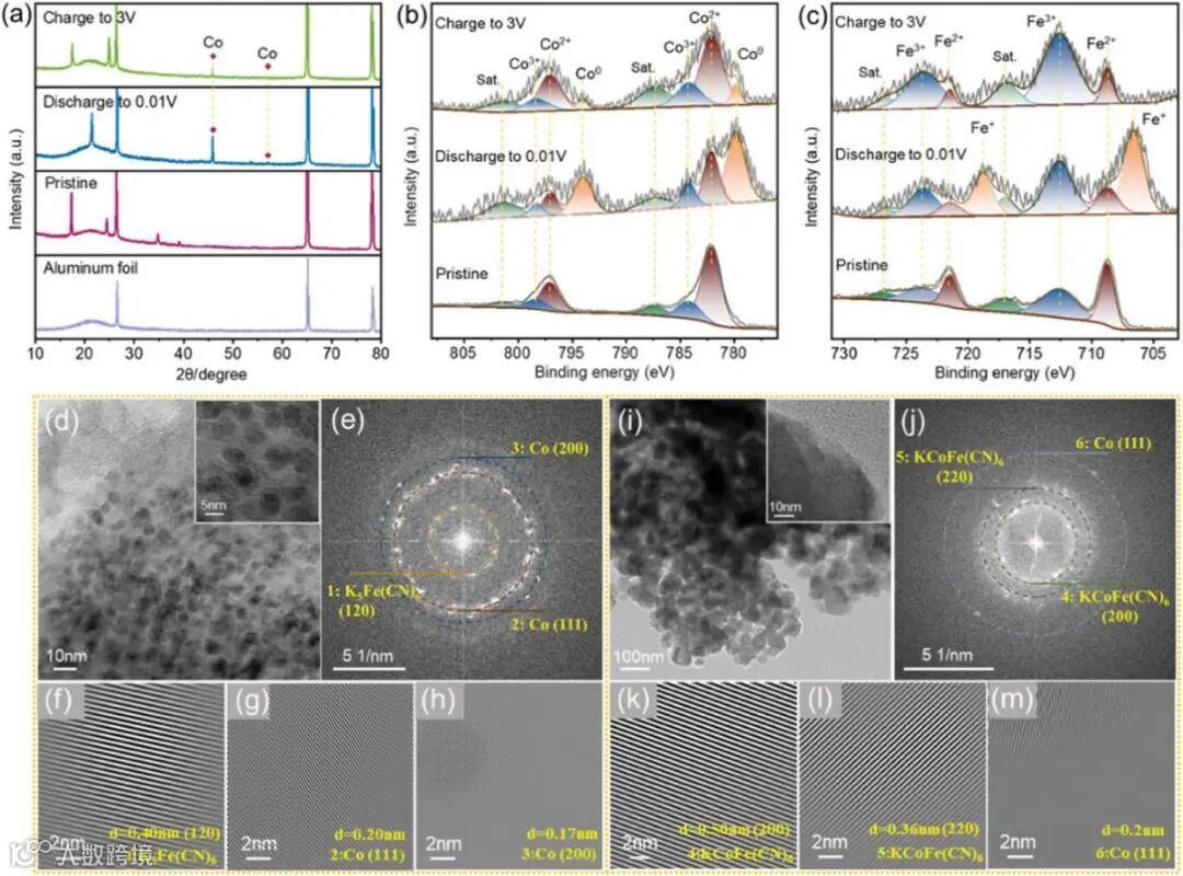 为了揭示CoFe PBA@NSC的电荷存储机理,对其进行了非原位X射线衍射、非原位X射线光电子能谱和非原位透射电子显微镜表征。多种非原位表征表明,CoFe PBA中碳、氮配位的铁和钴在钾离子插入/提取过程中对钾离子的存储都具有电化学活性,在完全放电状态下生成了钴单质纳米颗粒和Fe+。在随后的完全充电状态下,铁离子的化学状态是完全可逆的,同时仍然有少量的钴单质纳米颗粒残留。