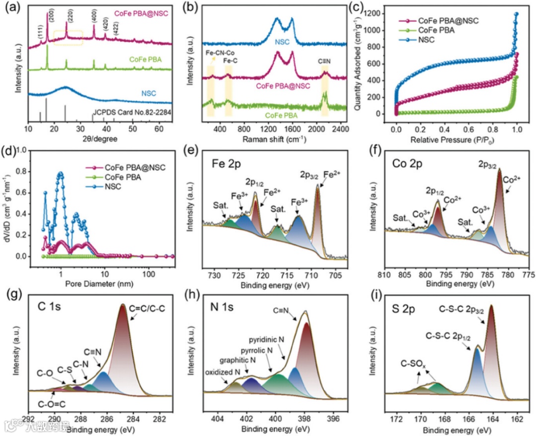 为了进一步说明复合材料的结构,使用拉曼光谱进行表征。观察到位于264、500和2150 cm−1处的峰对应于CoFe PBA中的Fe-CN-Co、Fe-C和C≡N键的振动(图2b)。同时,CoFe PBA@NSC的ID/IG值相对较高(ID/IG=2.41),证实了CoFe PBA@NSC中存在大量缺陷,这些缺陷可以归因于CoFe PBA@NSC中丰富的异质界面引入。另一方面,在引入NSC后,CoFe PBA@NSC杂化材料具有较高的比表面积和介孔特性。碳网络的大比表面积提供了丰富的活性中心,有利于电极材料与电解液更好地接触,同时缓解了循环过程中电极材料的体积膨胀。