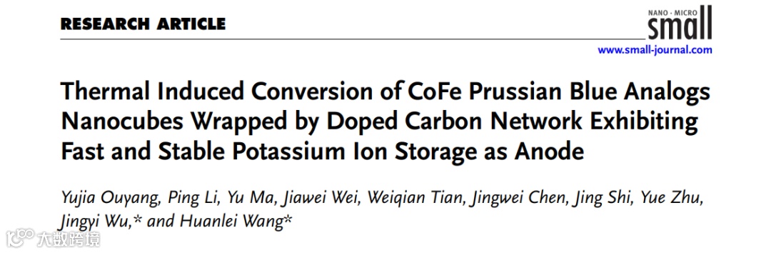 近日,中国海洋大学王焕磊教授和吴敬一教授在国际知名期刊Small上发表题为“Thermal Induced Conversion of CoFe Prussian Blue Analogs Nanocubes Wrapped by Doped Carbon Network Exhibiting Fast and Stable Potassium Ion Storage as Anode”的研究论文。该论文分析了通过热诱导原位转化法一步合成的氮硫掺杂碳包覆普鲁士蓝类似物复合材料用作钾离子电池负极的优异表现。值得注意的是,采用的热诱导原位转化策略提供了首次在高温下合成普鲁士蓝类似物的普适性新思路。