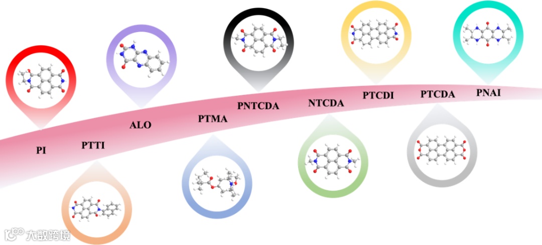 图7用于NH4+储存的不同有机材料和分子结构的示意图。