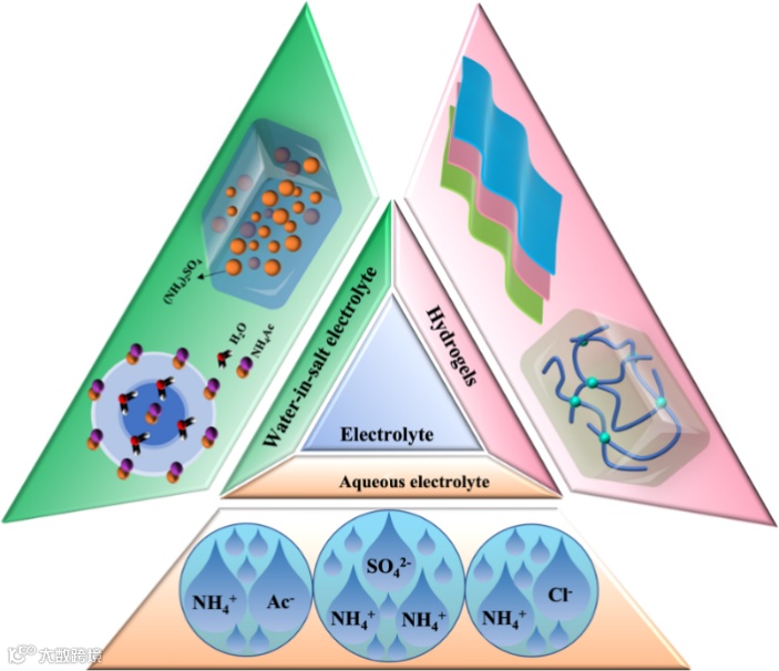 电解质是铵储存装置中重要的成分,在铵离子在正负电极之间的传输中起着重要作用。根据铵存储电解质的类型和浓度,铵根离子存储电解质通常可分为三种类型:铵盐水溶液电解质、盐包水电解质和凝胶电解质(图8)。