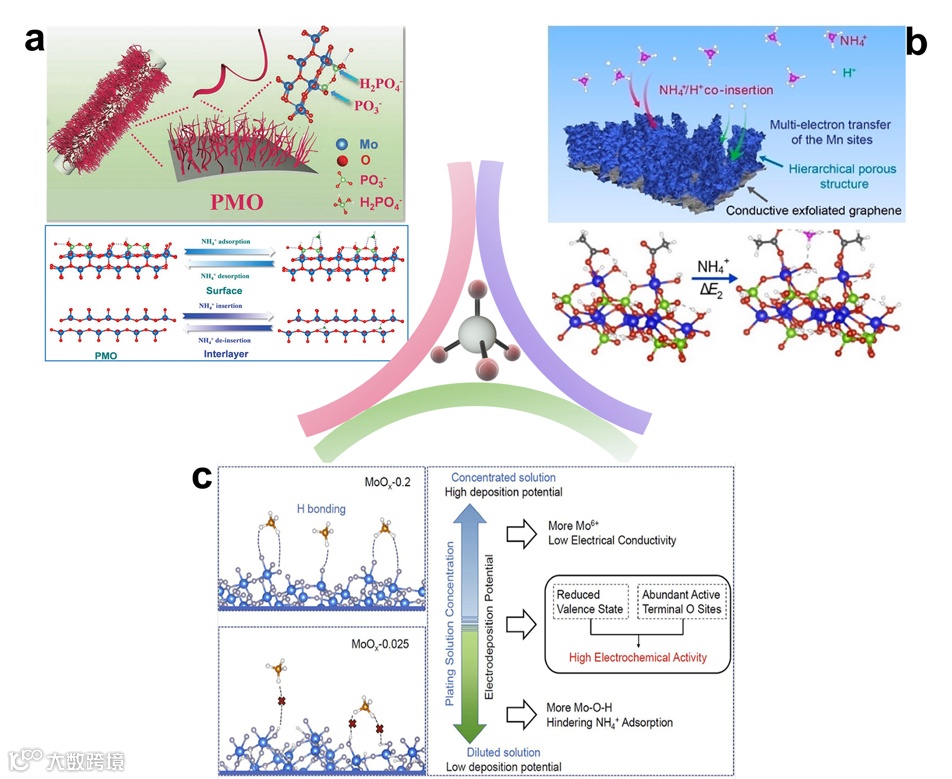 图6以表面配位为主的材料的铵储存机制示意图。(a)磷酸根离子功能化MoO3的表面NH4+储存机理示意图。(b)NH4+在乙酸根离子修饰的Mn3(PO4)2·7H2O表面的储存机理示意图。(c)不同比表面积的MoOx对NH4+的表面吸附示意图。