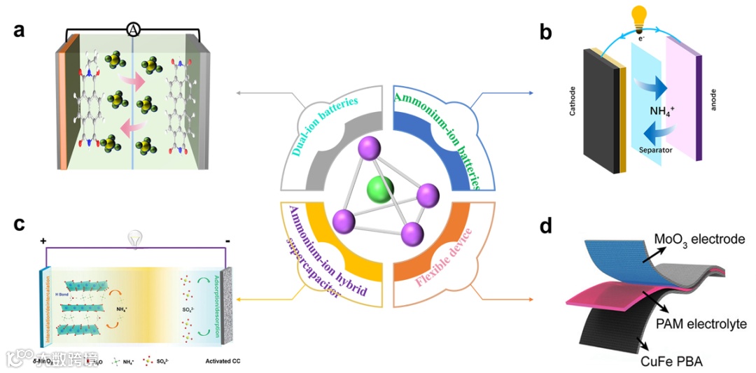 图9各种已开发的铵储存装置。(a)基于NH4+的双离子电池,(b)水系铵离子电池,(c)水系铵离子混合超级电容器,(d)柔性铵根离子电池。