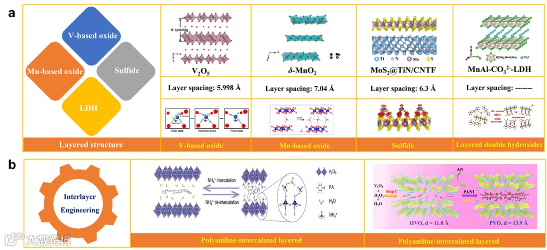 图3(a) 各种层状材料的结构特征和NH4+储存机制。(b) 一种提高NH4+存储容量的层间工程策略。