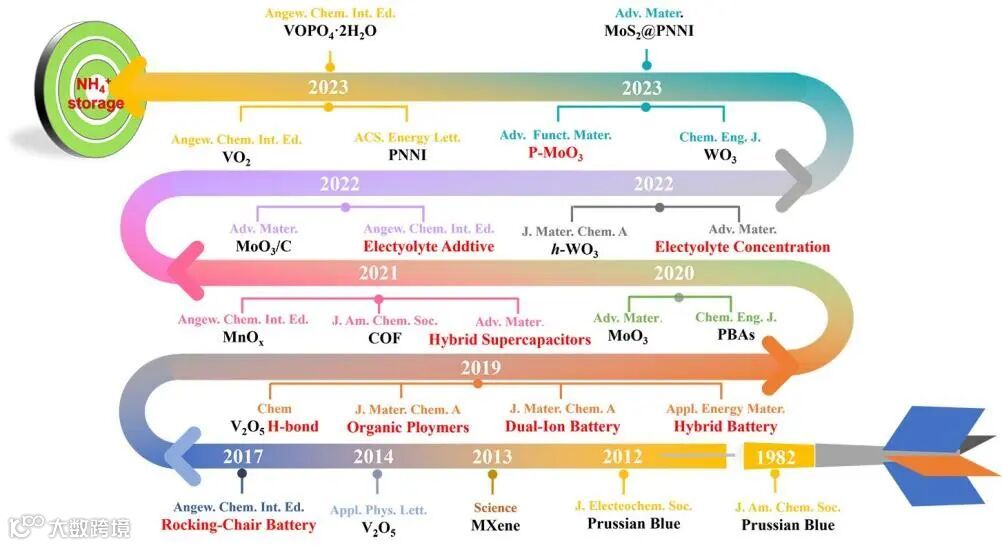 图2水系NH4+存储材料探索的时间线。