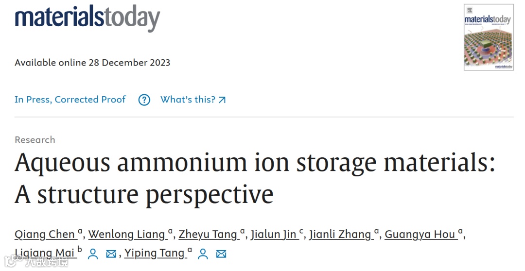 Qiang Chen, Wenlong Liang, Zheyu Tang, Jialun Jin, Jianli Zhang, Guangya Hou, Liqiang Mai*, Yiping Tang* “Aqueous Ammonium Ion Storage Materials: A Structure Perspective”, Materials Today