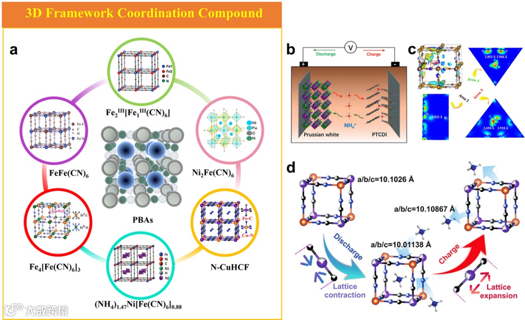 三维有机框架结构:三维有机框架配位化合物由于其大的框架结构而被认为是铵储存的良好宿主。普鲁士蓝类似物(PBAs,图5)是三维有机框架配位化合物材料的代表,通式为AxMa[Mb(CN)6]y·zH2O,其中A是嵌入框架间颗粒中的阳离子(Li+、Na+、Ca2+),M表示过渡金属离子(如Ni2+、Cu2+、Mn2+),x、A、b、y、z表示化学计量。此外,PBAs具有以下优点:i)该材料主要使用过渡金属盐溶液通过一步水热法合成,成本低,合成方法简单;ii)