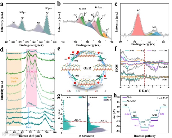 图5 Ni3S4/FeS@FNF OER测试后的XPS表征;原位Raman及DFT计算