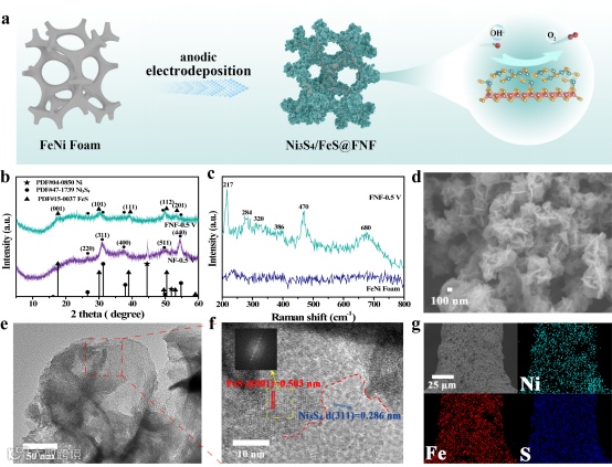 利用阳极电沉积法,在工作电极泡沫FeNi上原位构筑一层Ni3S4/FeS纳米花状异质结材料,制备过程仅需10 min。XRD与Raman图谱显示Ni3S4/FeS的成功制备,TEM中可以清晰的看到Ni3S4和FeS界面,EDS显示所有元素均匀分布。原位生长的催化剂避免了粘结剂的使用,可以更大程度的暴露出活性位点。此外,催化剂与基底附着力强,即使在大电流密度下,气泡的强烈冲击中仍然保持稳健,不易脱落。这是Ni3S4/FeS@FNF稳定性能优异的根本原因。
