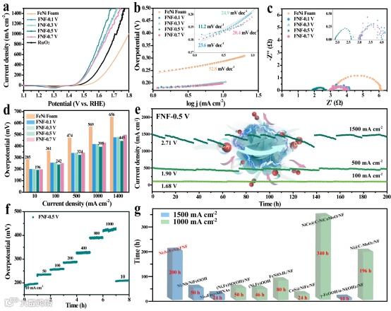 与其他催化剂相比,Ni3S4/FeS@FNF催化剂表现出非常优异的析氧性能。最低的塔菲尔斜率(11.2 mV dec-1)以及在低电流密度和高电流密度下均表现出最低的过电势(10 mA cm-2时为196 mV,1400 mA cm-2时为445 mV),表明反应过程中动力学有所改善。此外,该催化剂表现出优异的长期稳定性,在1500 mA cm-2的大电流密度下持续工作200小时性能没有明显下降。Ni3S4/FeS@FNF优异的电催化活性和耐用性,使其成为OER中有前途的候选者之一。