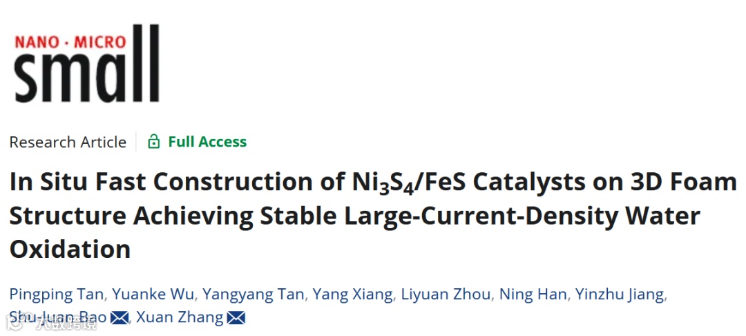 近日,西南大学包淑娟教授与浙江大学张漩研究员合作,在国际知名期刊Small上发表题为“In Situ Fast Construction of Ni3S4/FeS Catalysts on 3D Foam Structure Achieving Stable Large-Current-Density Water Oxidation”的研究文章。该研究首次利用阳极电沉积法,原位快速构建了表面高Ni3+含量的Ni3S4/FeS催化剂。Ni3S4/FeS异质结构和电化学诱导的NiOOH共同增强了OER动力学。Ni3S4/FeS@FNF显示出最优异的OER活性,塔菲尔斜率仅为11.2 mV dec-1,在10 mA cm-2和1400 mA cm-2的电流密度下,过电势分别为196 mV和445 mV。此外,Ni3S4/FeS@FNF可以在1500 mA cm-2的电流密度下稳定运行200小时,性能没有明显下降。总之,这项工作通过阳极电沉积策略显著提高了镍基OER电催化剂中高活性Ni3+的含量。这种简单高效的阳极电沉积方法对于合成富含高价金属离子的材料具有普遍性和指导意义,有望在其他领域得到广泛应用。