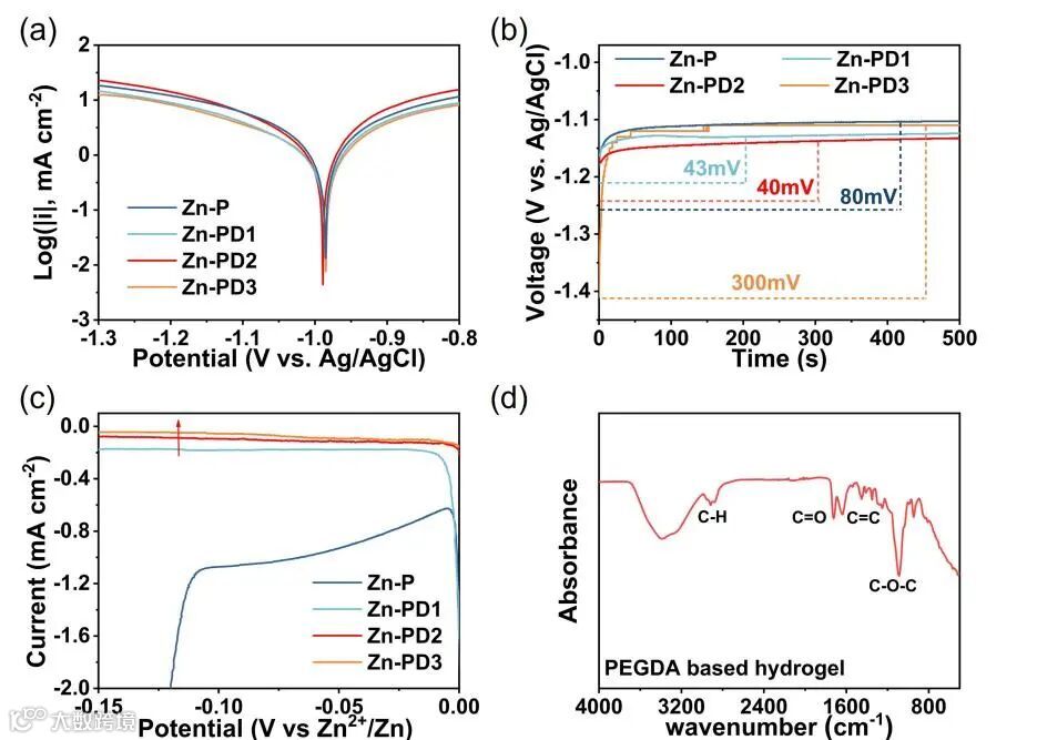 Fig. 1. (a) Linear polarization curves illustrating the corrosion on Zn-P anode and Zn-PD anodes. (b) Nucleation overpotential of Zn-P anode and Zn-PD anodes. (c) Linear scan voltammetry (LSV) curves of Zn-P//stainless steel (SS) and Zn-PD//SS anode cells at a scan rate of 0.1 mV s-1. (d) FTIR spectra of PEGDA based hydrogel.