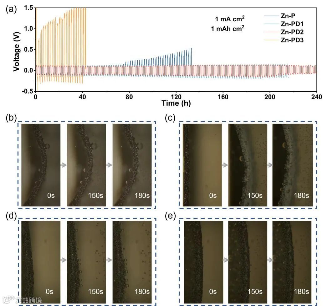 Fig. 2. (a) Voltage-time profiles of Zn-P and Zn-PD based symmetrical cells. (b-e) In situ optical microscopy visualization of Zn plating on Zn-P and Zn-PD anodes at different plating stages.