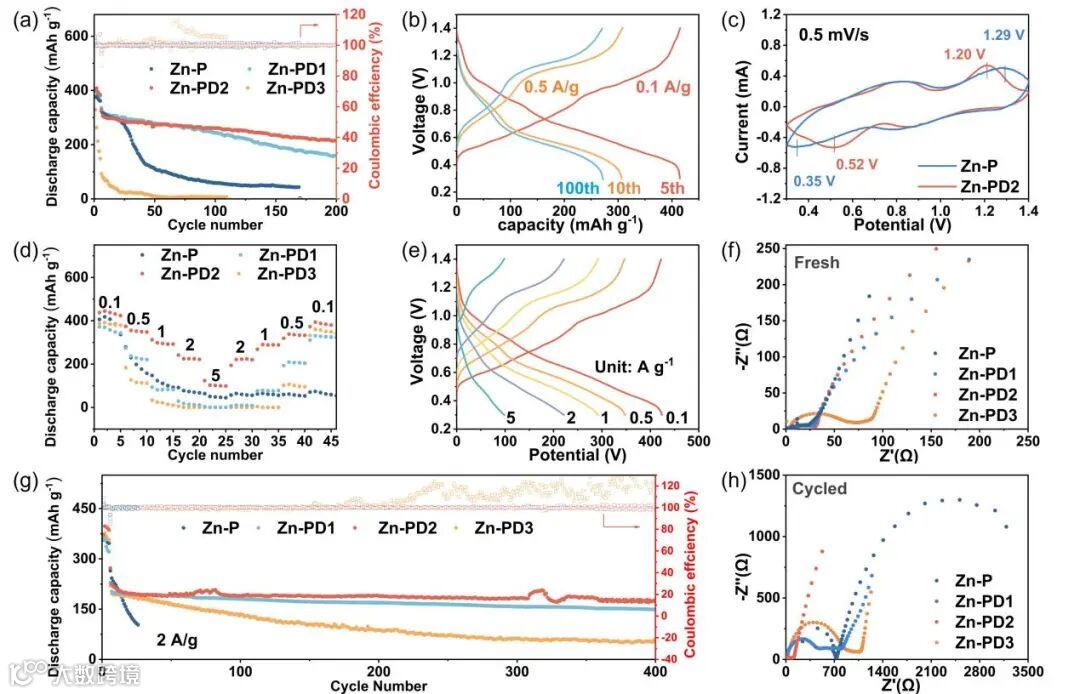 在NH4V4O10 (NVO)//Zn全电池性能对比中,由Zn-PD负极构筑的水系锌离子电池表现优异。在长循环测试中, NVO//Zn-PD2全电池在2 A g-1电流密度下具有超过400次的循环寿命。