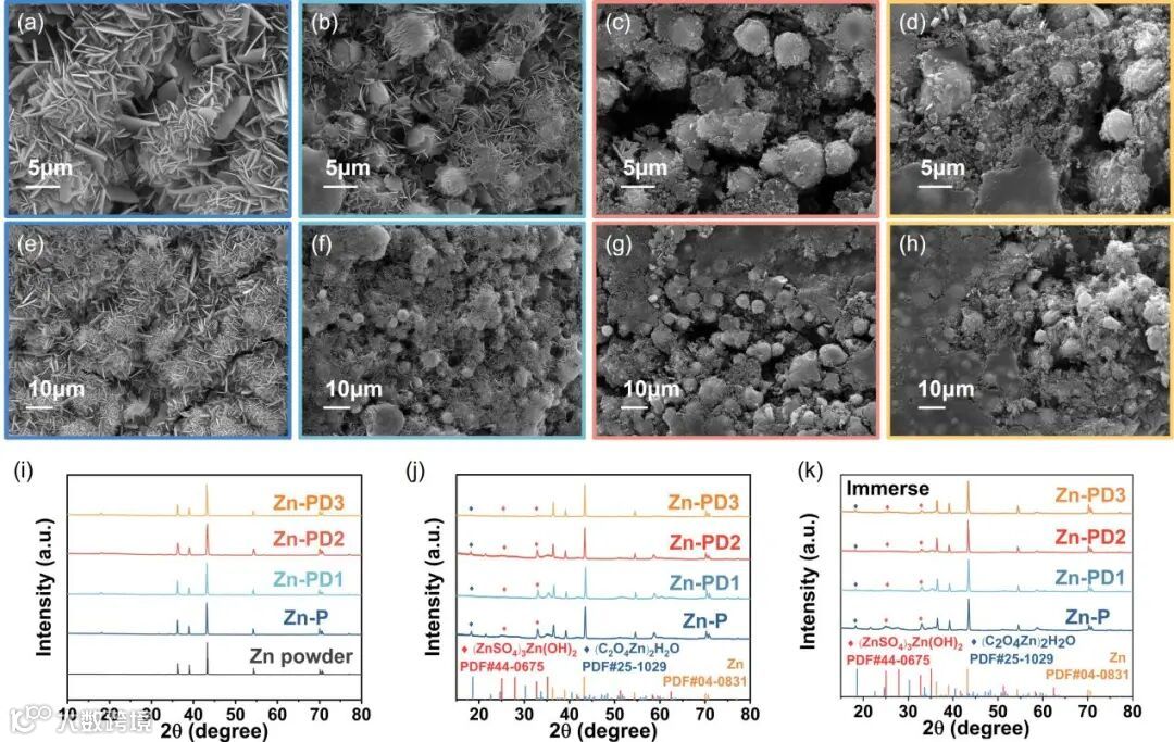 Fig. 4. Top-view SEM images of Zn electrode cycled for NVO//Zn cell at 0.5A/g: (a, e) Zn-P anode; (b, f) Zn-PD1 anode; (c, g) Zn-PD2 anode; (d, h) Zn-PD3 anode; XRD patterns of Zn-P and Zn-PD anodes (i) before and (j) after cycle. (k) XRD patterns of Zn-P and Zn-PD anodes immersed in 2M ZnSO4 for 30 days.