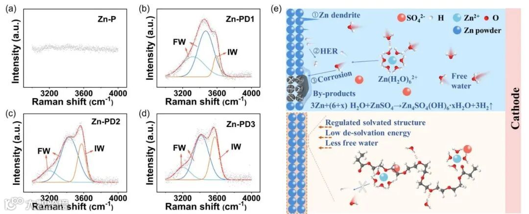 拉曼测试结果进一步证明水分子、Zn2+和PEGDA在界面处的相互作用,FW和IW比值的降低表明Zn-PD负极界面中自由水的比例降低,表明水的活性降低,由水诱导而进行的副反应受到抑制。