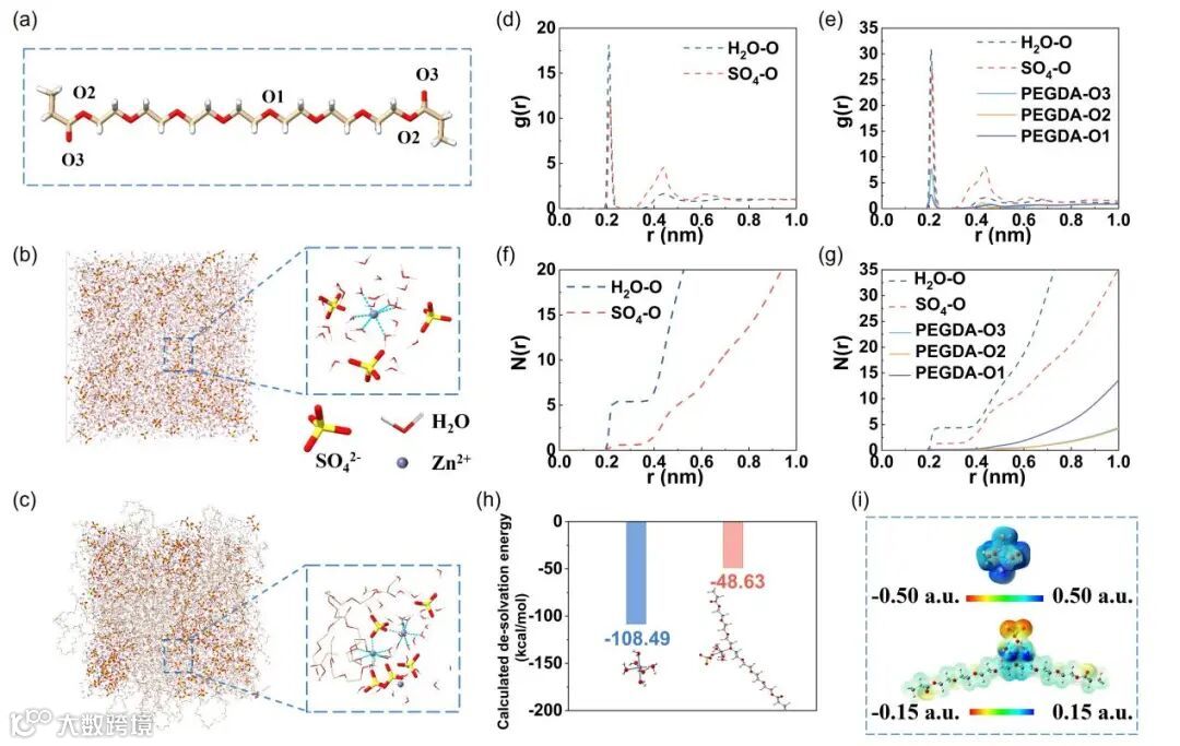 Fig. 5. Molecular dynamics (MD) simulation. (a) Molecular structure of PEGDA. (b, c) Snapshots of the interfacial chemical environment of the (b) Zn-P anode and (c) Zn-PD anode. (d, e) RDFs of Zn2+ solvation sheath in (d) Zn-P and (e) Zn-PD anode. (f, g) Corresponding coordination numbers of Zn2+ solvation sheath in (f) Zn-P and (g) Zn-PD anode. (h) The calculated de-solvation energy barriers in Zn-P and Zn-PD anode interfaces. (i) Electrostatic potential mapping of the original Zn2+-6H2O and [Zn(PEGDA)(SO4)(H2O)x]2+ solvation structures.