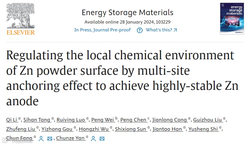 近日,华中科技大学的闫春泽教授与方淳副教授合作,在知名期刊Energy Storage Materials上发表题为“Regulating the local chemical environment of Zn powder surface by multi-site anchoring effect to achieve highly-stable Zn anode”的文章,提出了一种通过调节锌负极界面的局部化学环境来稳定锌负极的改性策略。