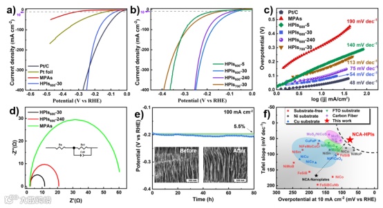 图2. 不同电极的电化学测试结果。a,b) 在1M KOH中,20% Pt/C、Pt箔、MPAs、HPIs600-30、HPIs600-240、HPIs700-30和HPIs600-5的极化曲线。c) 从a,b)的极化曲线中计算得到的Tafel斜率。d) HPIs600-30、HPIs600-240和MPAs的EIS分析和拟合。插图是用于拟合EIS的等效电路。e) 在恒定电流密度为100 mA cm-2下获得的HPIs600-30的计时电位曲线。插图是稳定性测试前后的HPIs600-30的SEM图像。f) 要达到10 mA cm-2的过电位与Tafel斜率之间的关系,比较了本研究与其他可自支撑HER催化剂。