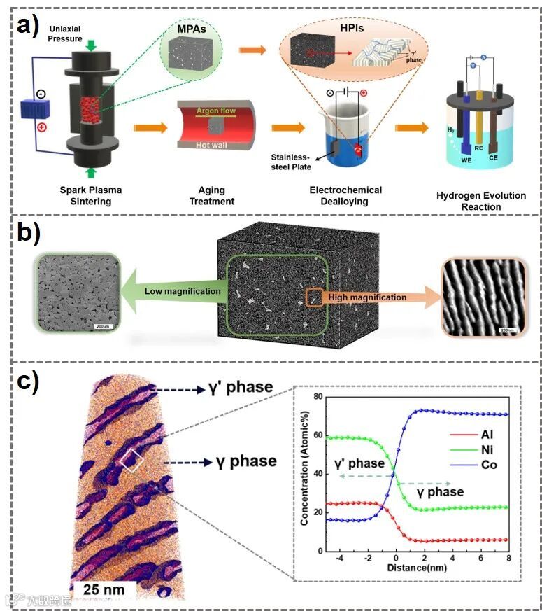图1. a) 多级孔异质结构金属间化合物 (HPIs) 的制备过程的示意图,包括放电等离子烧结、时效热处理、电化学腐蚀步骤。b) 多级孔结构示意图,低放大倍数下可见微米级大孔,高倍下可见纳米级片层。c) HPIs600-30中Al、Co和Ni元素分布的APT图像。