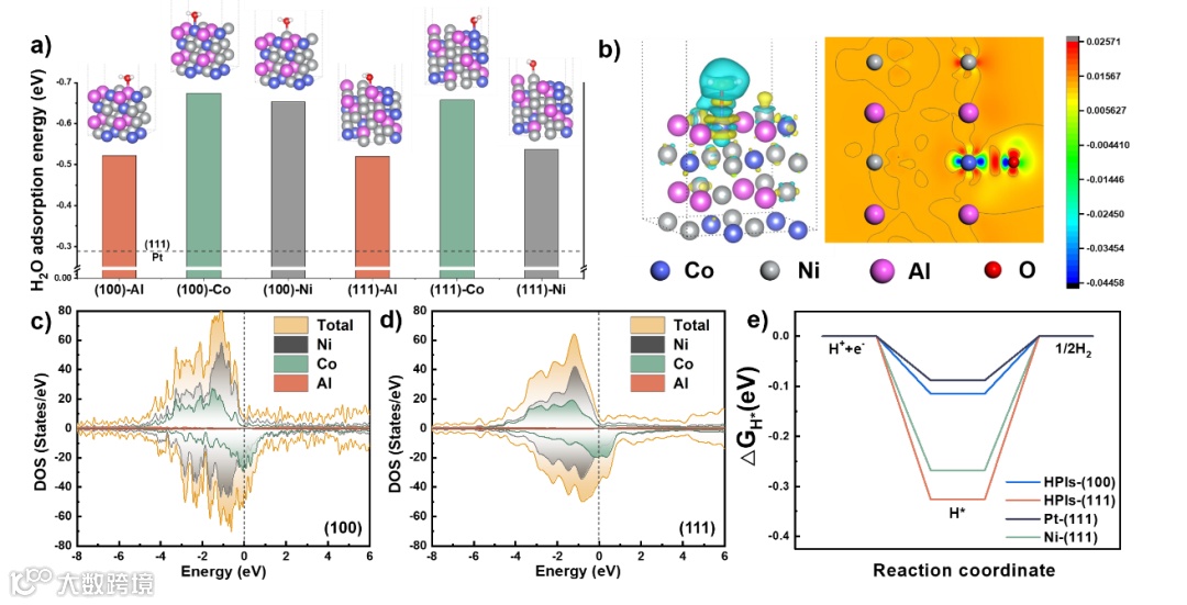 图3. 第一性原理计算结果。a) H2O分子吸附在HPIs600-30的γ'相的不同晶面上(顶部的Al、Co或Ni原子)的能量,以及吸附在纯Pt的 (111) 晶面上的能量。(b) 在(100)-Co上吸附H2O后的差分电荷密度。c) (100)和d) (111)表面的γ'相的态密度 (DOS),其中零能量处的虚线代表费米能级(Ef)。e) 氢在 (100) 和 (111) 表面以及Pt-(111) 和Ni-(111) 表面上的吉布斯自由能 (ΔGH*)。