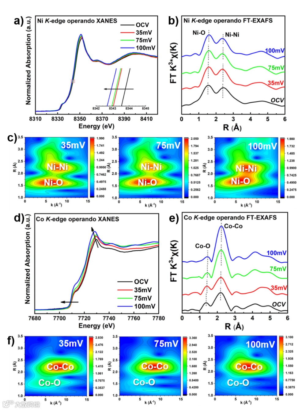 图4. 原位XAFS分析。HPIs600-30在开路电压(OCV)和不同过电位下的原位Ni K边和Co K边XAFS光谱。a) Ni K边和d)Co K边XANES光谱;b) Ni K边和e) Co K边的相应FT-EXAFS光谱。c) Ni K边和f) Co K边的小波变换。