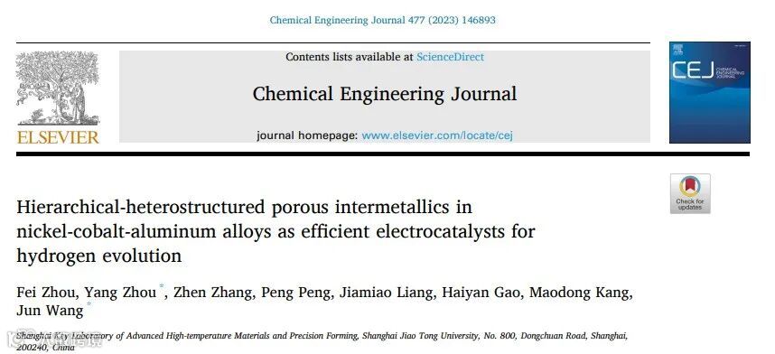 近日,来自上海交通大学的王俊教授与周阳副研究员,在国际知名期刊Chemical Engineering Journal上发表题为“Hierarchical-heterostructured porous intermetallics in nickel-cobalt-aluminum alloys as efficient electrocatalysts for hydrogen evolution”的研究文章,文章第一作者为博士研究生周菲。