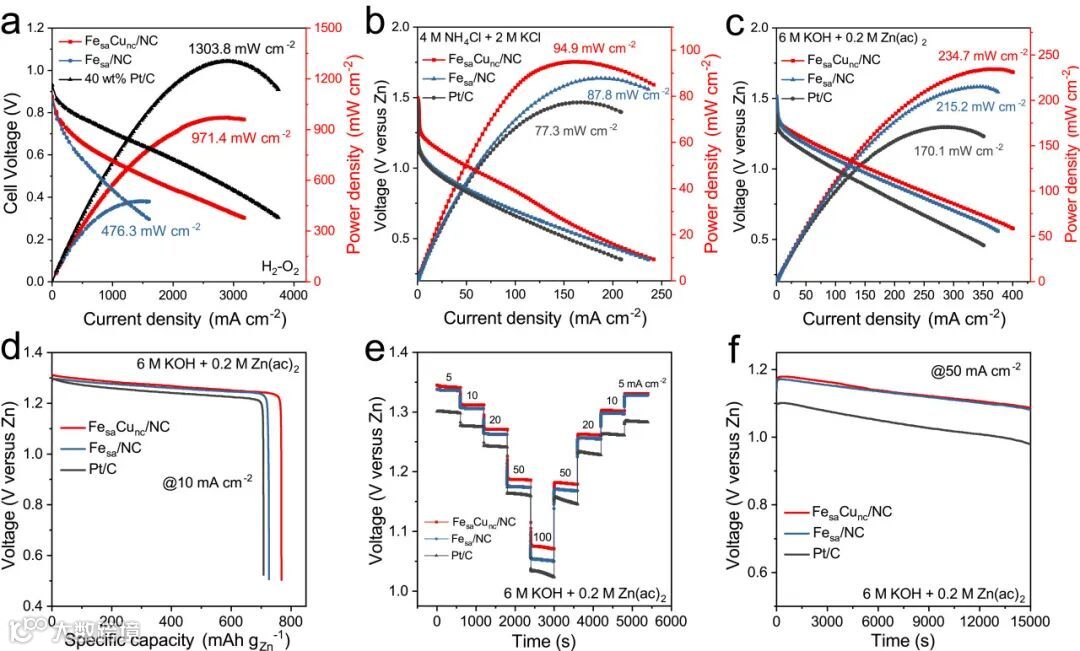 FesaCunc/NC催化剂在各能源器件中也具有良好的活性,在氢氧燃料电池、中性和碱性锌空气电池中的最大功率密度分别为971.4、94.9和234.7 mW cm-2,显示了其在实际应用中的巨大潜力。同时,碱性锌空气电池具有更高的比容量和长时间放电稳定性。