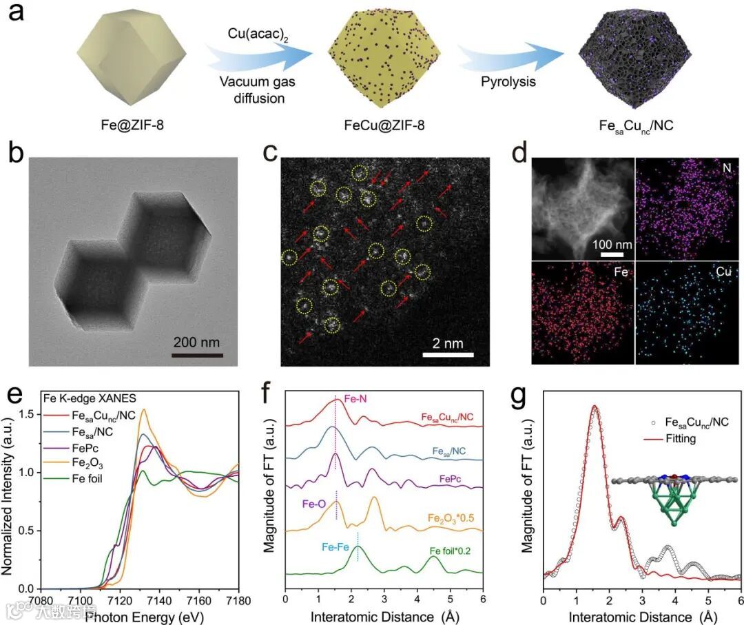 FesaCunc/NC为多孔菱形十二面体结构,铁单原子和铜纳米团簇在氮掺杂碳载体上均匀分布。同步辐射表征进一步证明了金属复合位点的成功合成。