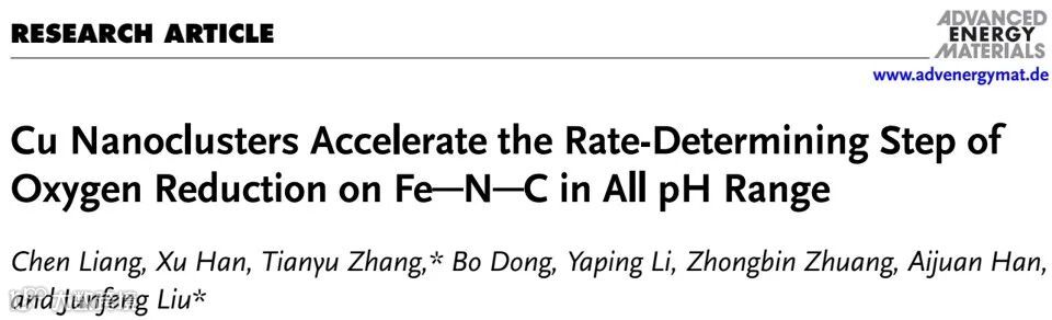 近日,北京化工大学刘军枫教授团队在国际知名期刊Advanced Energy Materials上发表了题为”Cu Nanoclusters Accelerate the Rate-Determining Step of Oxygen Reduction on Fe─N─C in All pH Range”的研究文章。