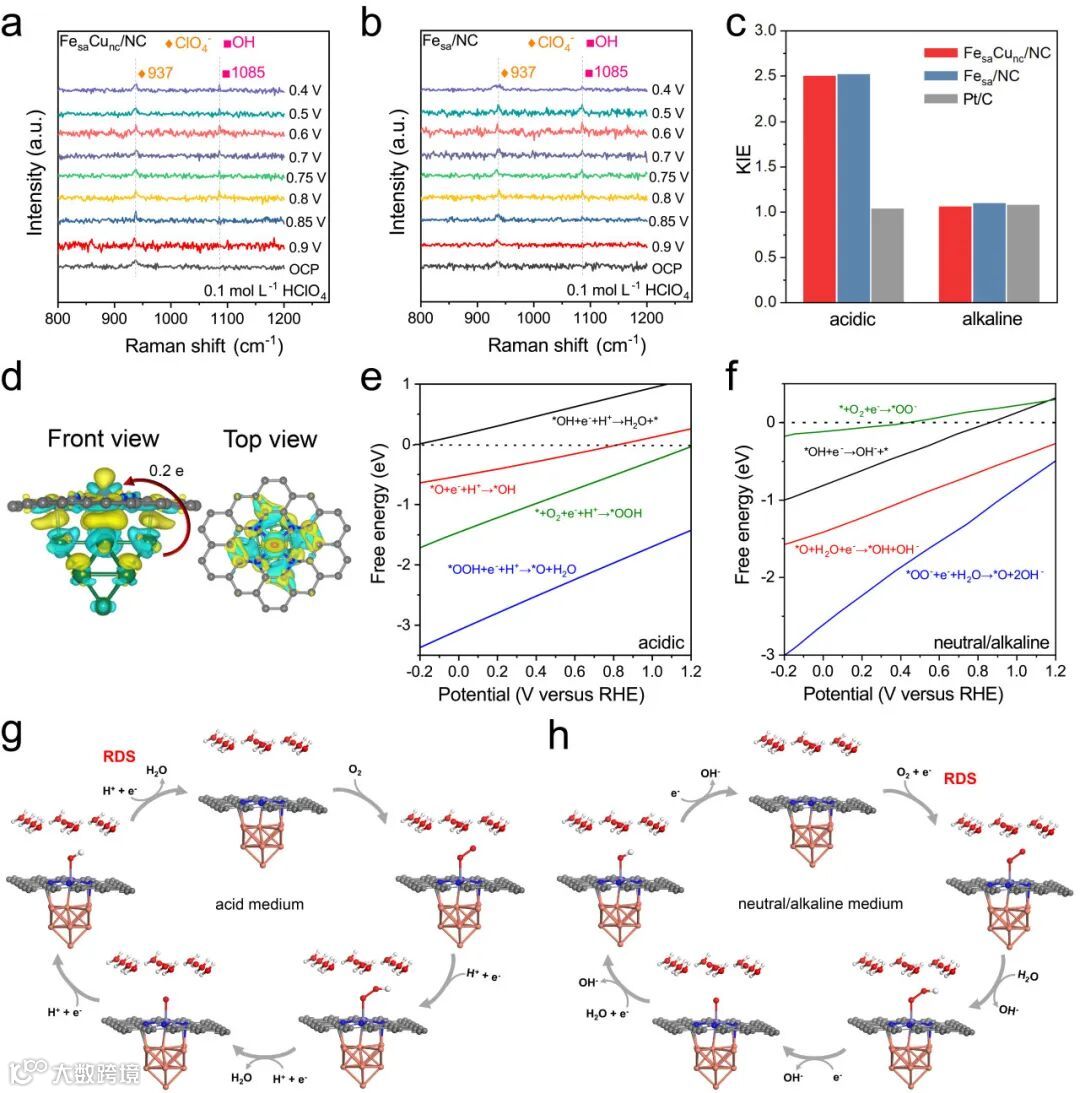 通过电化学原位Raman表征、同位素动力学效应(KIE)实验和理论计算相结合,说明在酸性条件下*OH + e-+ H+ → H2O + *是反应的速率决定步骤(RDS),而在中性和碱性条件下为*O2 + e- → *O2-。Cu团簇的引入没有改变,但是促进了不同pH下的RDS。