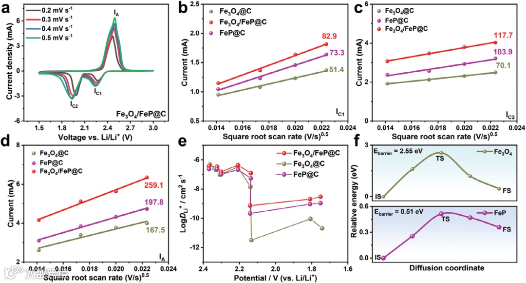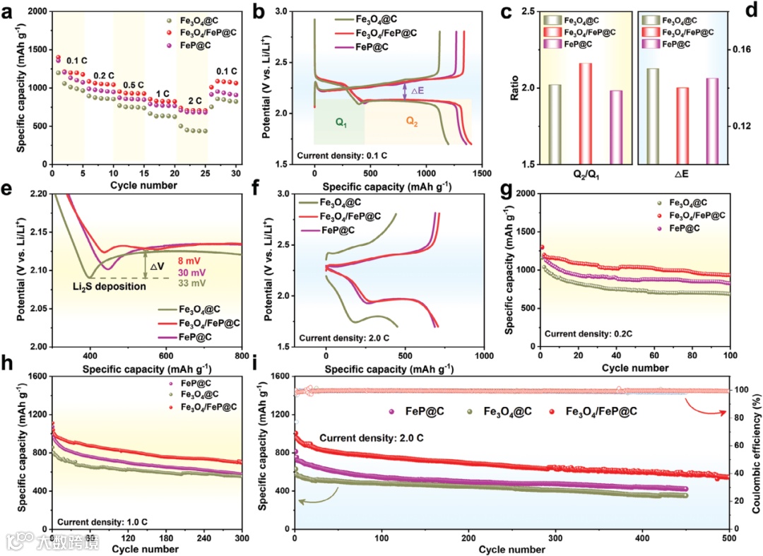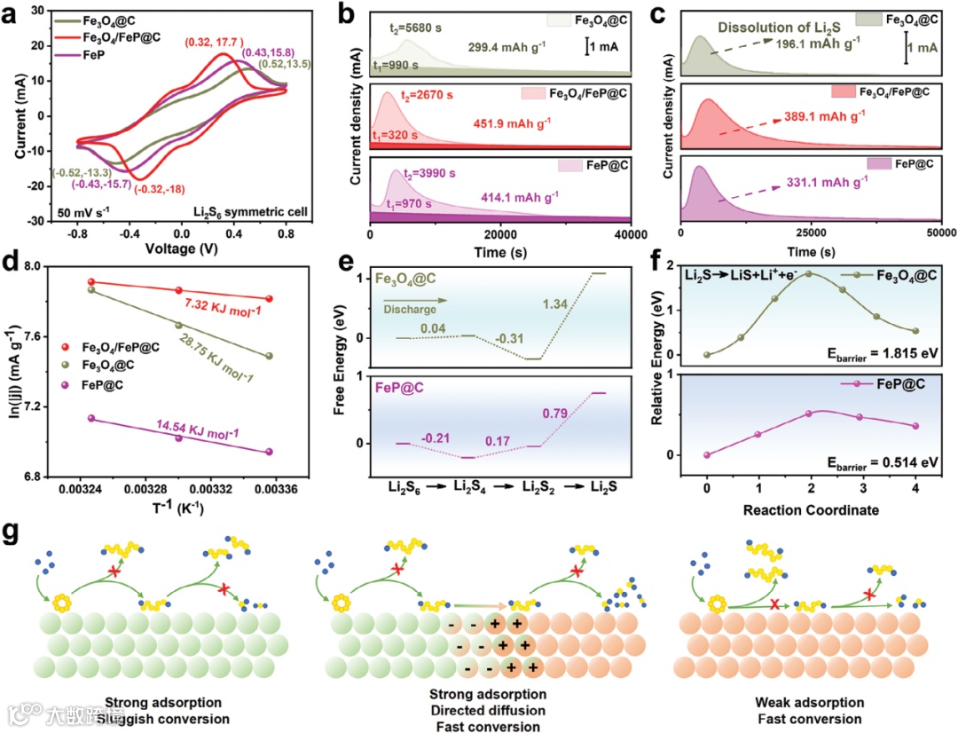 具体来说,受细胞工厂和纳米反应器的启发,利用纳米反应器封装催化剂和活性硫,使硫物种的运动都限制在框架内,而锂离子则可以自由移动。因此,作者利用硬模板法合理设计了Fe3O4/FeP@C的异质结构,证明了上述电催化剂的设计原理。半导体Fe3O4具有较强的吸附能力和较低的催化活性,而金属FeP具有中等的吸附能力和较好的催化活性。BIEF作为桥梁将两者连接起来,使多硫离子从Fe3O4定向迁移到FeP上进行催化转化。本研究为设计一种高性能的电催化剂提供了一种有效的策略。该研究得到了国家自然科学基金、广东省重点领域研究发展计划、广东省燃料电池技术重点实验室研究基金计划、佛山创新创业团队引进项目的资助与支持。