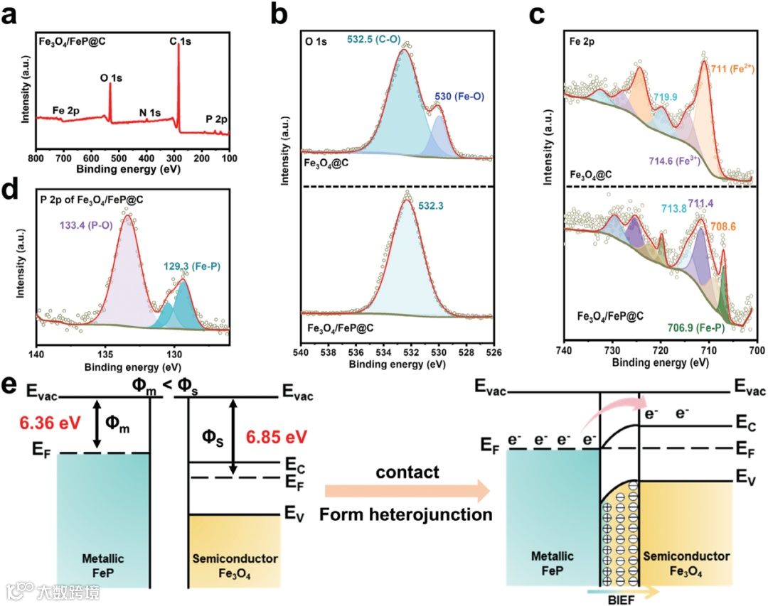 图3. Fe3O4/FeP@C纳米反应器的XPS图谱及内建电场结构示意图