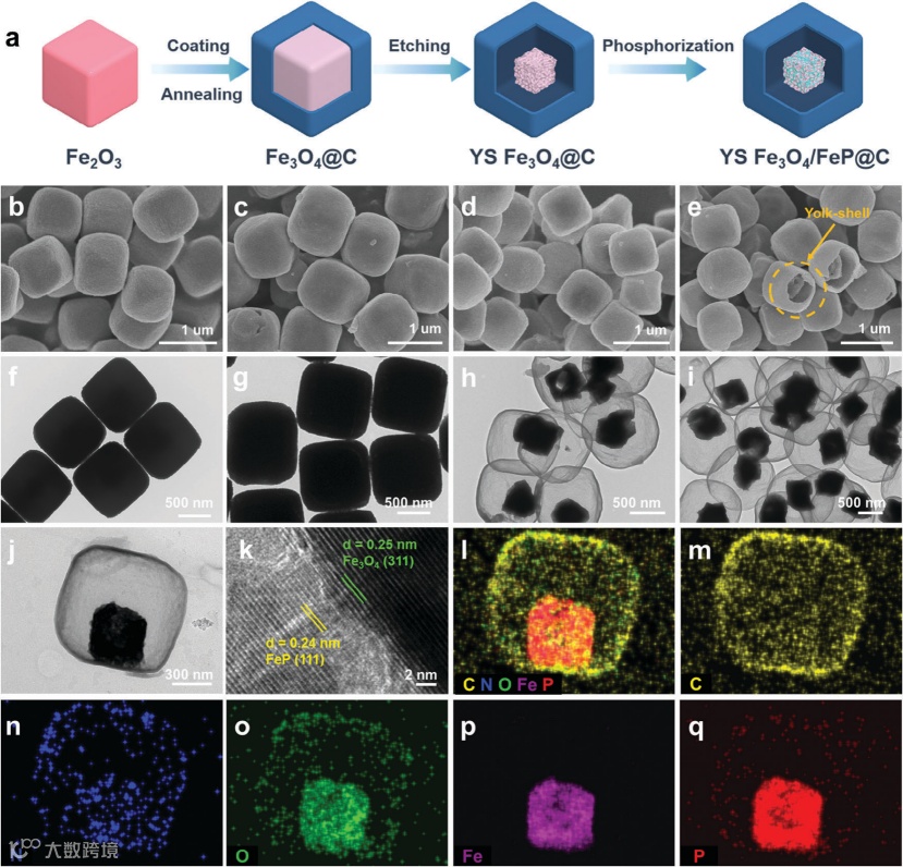 图2. 蛋黄-蛋壳Fe3O4/FeP@C纳米反应器的合成过程及相关表征