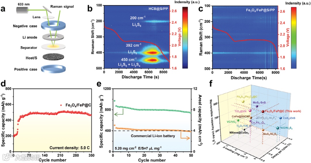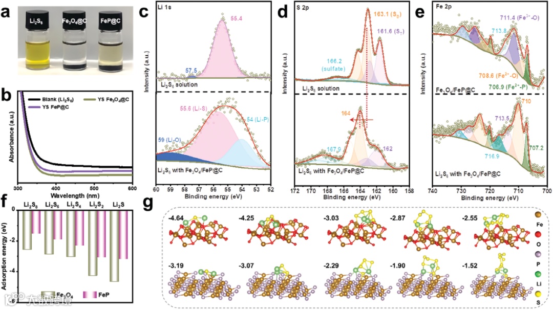 图8. Fe3O4/FeP@C纳米反应器对多硫化物捕获效果,及高倍率和高硫载下的电化学性能