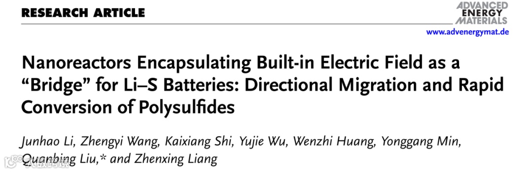 近日,广东工业大学刘全兵教授课题组和华南理工大学梁振兴教授课题组联合在国际知名期刊Advanced Energy Materials上发表题为“Nanoreactors Encapsulating Built‐in Electric Field as a “Bridge” for Li–S Batteries: Directional Migration and Rapid Conversion of Polysulfides”的研究性文章。