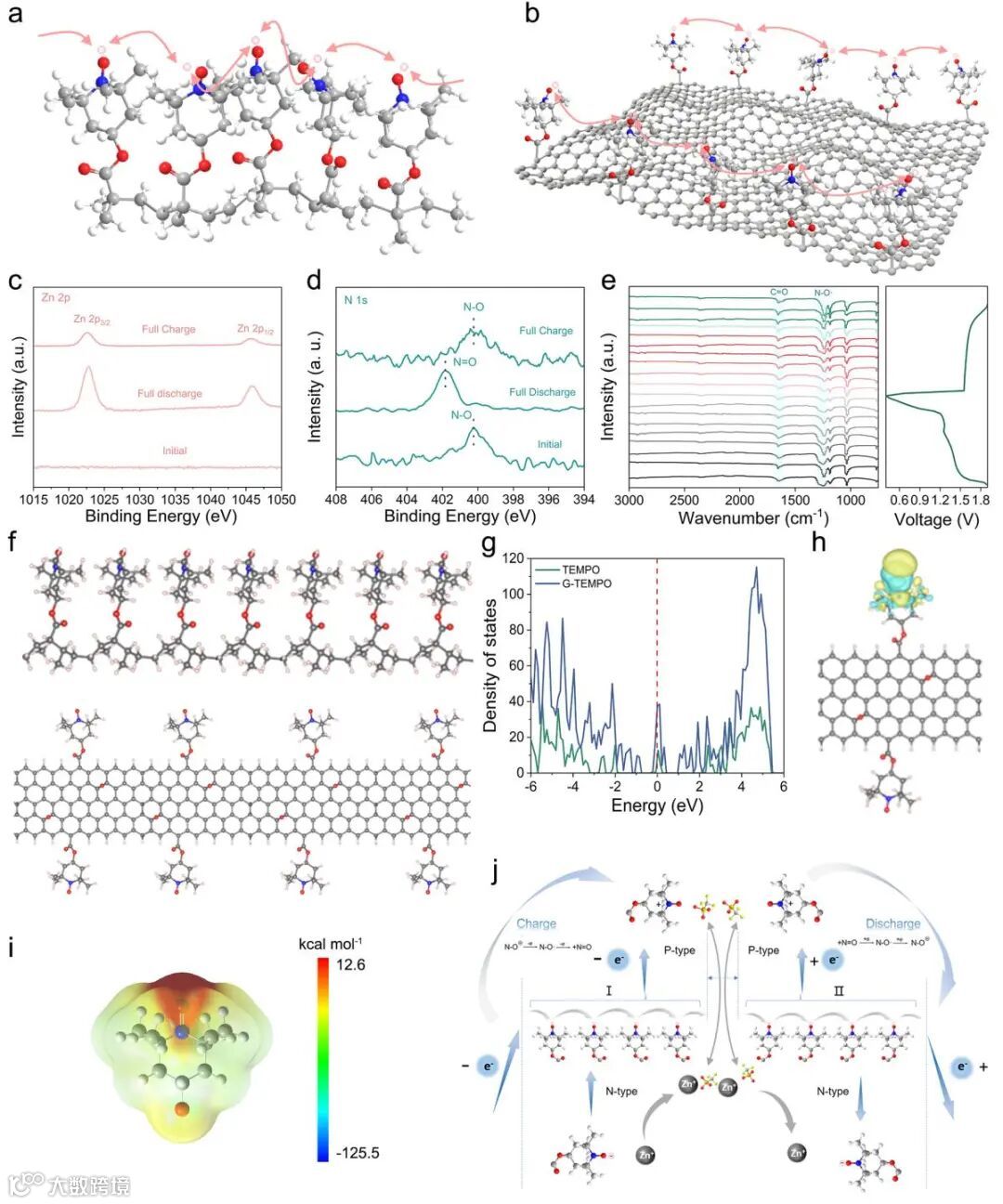 图5 a) PTMA和b) G-TEMPO不同结构的NO自由基正极中的电子跳跃传输。不同充放电阶段c) Zn 2p和d) N 1s的非原位高分辨XPS图谱。e) M3DP-MXene/Cu-THBQ/Zn-P//G-TEMPO全电池的原位FTIR光谱。f) TEMPO聚合物和G-TEMPO的计算结构。g) TEMPO与G-TEMPO的态密度。h) G-TEMPO的差分电荷密度。i) TEMPO的静电势(ESP)。j) M3DP-MXene/Cu-THBQ/Zn-P//G-TEMPO全电池充放电过程中可逆的Zn2+储存机制。
