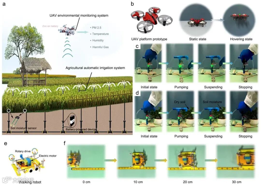 图6 a)锌离子电池在农业场景中的应用图。b) 无人机平台原型及其不同运动状态的光学照片。c) 由锌离子电池供电的湿度传感器/水泵集成装置的光学照片。d)锌离子电池-湿度传感器-水泵集成装置的实际灌溉光学照片。e,f)由两个串联连接的锌离子电池供电的行走机器人的运动表现和光学照片。
