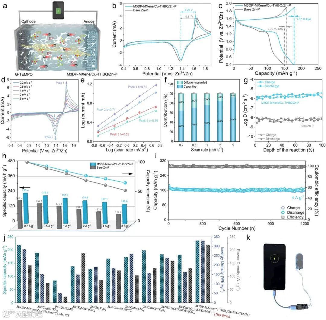 图4. a)M3DP-MXene/Cu-THBQ/Zn-P//G-TEMPO全电池的工作原理。b) M3DP-MXene/Cu-THBQ/Zn-P//G-TEMPO和裸Zn-P//G-TEMPO的CV和c) GCD曲线。d)在不同扫描速率下测量的M3DP-MXene/Cu-THBQ/Zn-P//G-TEMPO全电池的CV曲线。e)每个氧化还原峰处的Log(i) vs log(v)图。f) 不同扫描速率下电容控制和扩散控制的贡献率。g) M3DP-MXene/Cu-THBQ/Zn-P//G-TEMPO全电池的Zn2+扩散系数。h) M3DP-MXene/Cu-THBQ/Zn-P//G-TEMPO和裸Zn-P//G-TEMPO在不同电流密度下的倍率性能。i) M3DP-MXene/Cu-THBQ/Zn-P//G-TEMPO全电池在4 A g-1下的长期循环性能。j)这种M3DP-MXene/Cu-THBQ/Zn-P//G-TEMPO全电池的电化学性能与以前研究中的电化学性能的比较。k)两个并联的纽扣电池可作为手机提供稳定的充电电压。