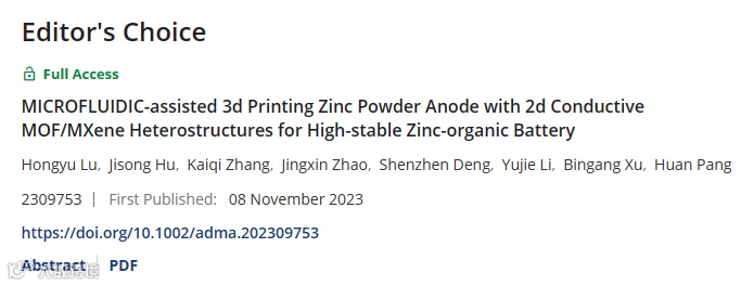 2023年11月,扬州大学庞欢教授&香港理工大学赵景新博士、徐宾刚教授&哈尔滨工业大学李宇杰教授团队合作在Advanced Materials期刊(影响因子>29)在线发表论文“Microfluidic-assisted 3D Printing Zinc powder Anode with 2D Conductive MOF/MXene Heterostructures for High-stable Zinc-organic Battery”,该研究团队通过微流控辅助3D打印策略成功制备了一种具有异质结构功能层的耐腐蚀锌粉基负极,其功能层由MXene和Cu-THBQ (MXene/Cu-THBQ)异质结构组成。得益于MXene/Cu-THBQ功能层的良好的抗腐蚀性和对Zn2+的强吸附性,制备得到的锌粉基负极可以有效地均衡电镀/剥离过程中的锌离子通量,并抑制析氢反应,从而实现锌负极的稳定循环。此外,该负极与铆接在石墨烯上的4-羟基-2,2,6,6-四甲基哌啶-1-氧基有机正极匹配得到的锌-有机全电池可实现高可逆放电容量以及长循环稳定性。本文共同第一作者为哈尔滨工业大学博士研究生卢虹宇、张凯琪、华中科技大学博士研究生胡吉松。