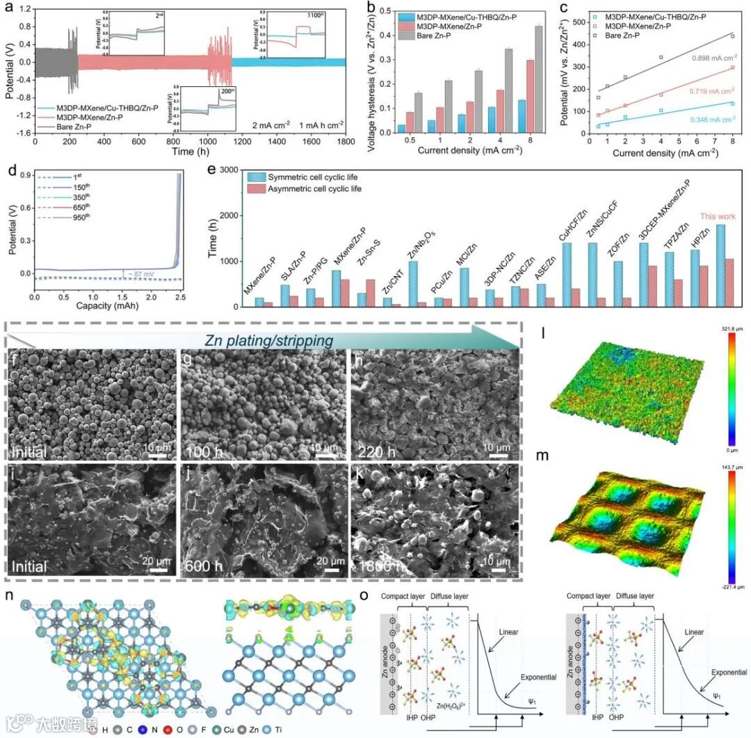 图3. a) M3DP-MXene/Cu-THBQ、M3DP-MXene/Zn-P和裸Zn-P对称电池在2mA·cm-2电流密度和1mA·h·cm-2限制容量下的长循环性能。b) 在从0.5到8 mA·cm-2的不同电流密度下的电压滞后。c)在M3DP-MXene/Cu-THBQ、M3DP-MXene/Zn-P和裸Zn-P对称电池中不同倍率下的交换电流密度曲线。d) M3DP-MX ene/Cu-THBQ负极在5 mA cm-2下的电压曲线。e) M3DP-MXene/Cu-THBQ/Zn-P与最近研究中的对称和不对称电池周期寿命的比较。f-h) 裸Zn-P负极和 i-k) M3DP-MXene/Cu-THBQ/Zn-P负极在不同循环时间的SEM图像。l)裸Zn-P负极和m) M3DP-MXene/Cu-THBQ/Zn-P负极的LCSM图像。n) MXene和Cu-THBQ之间界面的差分电荷密度。o)裸Zn和M3DP-MXene/Cu-THBQ/Zn-P的EDL结构示意图。